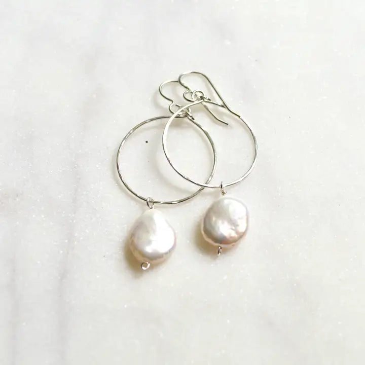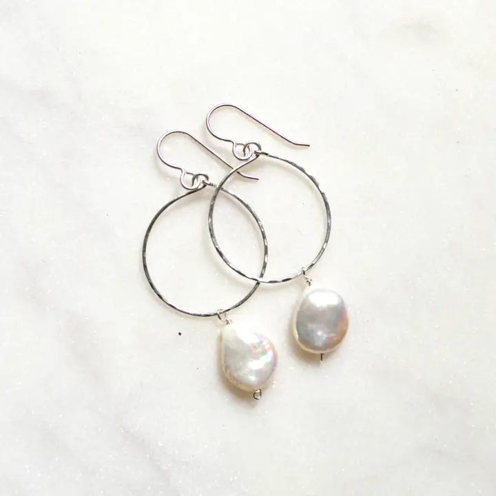 Cream colored freshwater pearls simply dangle from hammered 20g sterling silver hoops. Hoops are 1.5" Pearls are 11-12mm, vary in shape and have slight imperfections.