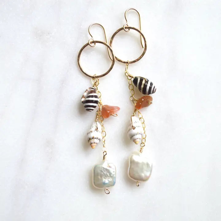 Tiny gold filled hammered hoops have a cluster of assorted shells, carnelian stones and freshwater pearls dangling from a gold filled chain. Hoops measure 3/4" and chain length is 1 3/4".